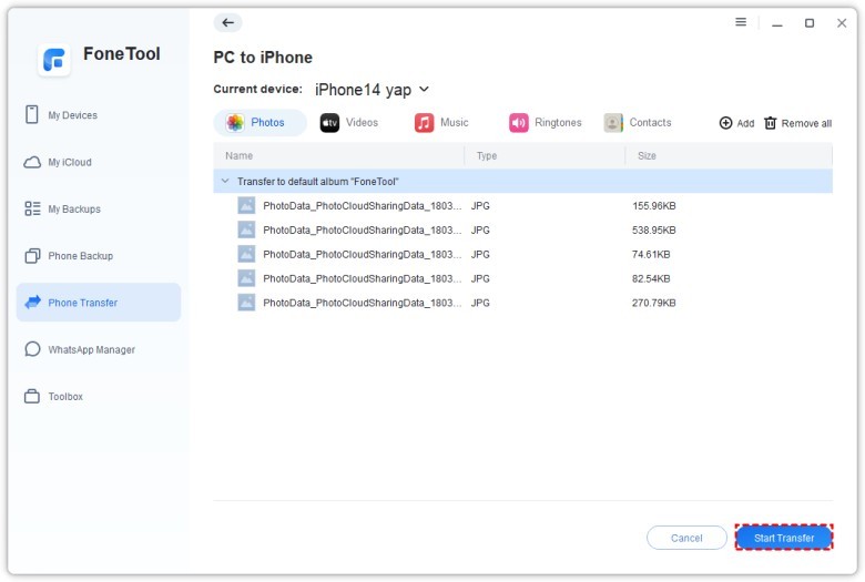 Step 5. Disconnect your old iPhone and connect your new iPhone to the same computer with a USB cable. Then go to "Phone Transfer" and select "PC to iPhone". Then drag the required data from the folder where the data is stored to the data frame. Tap “Start Transfer” to transfer data from one iPhone to another.