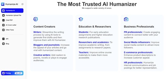 Humanize AI positions itself as the lighthouse for content creators by providing unique AI detection, anti-detection, and text humanization efficiencies with the single purpose of removing any traces of AI generation without sacrificing the naturalness or integrity of the content.