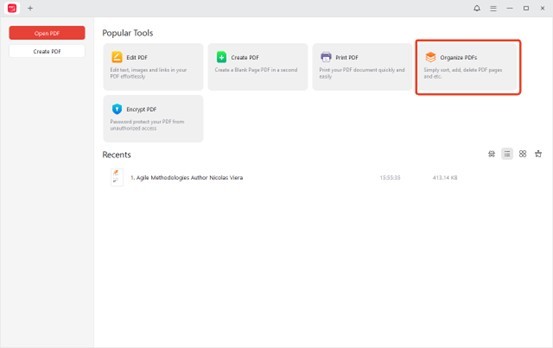 Enter editing mode: Click “Organize PDF” to open the file in the editor