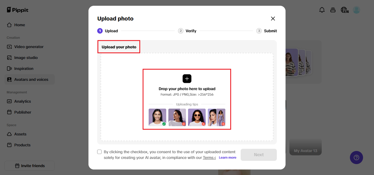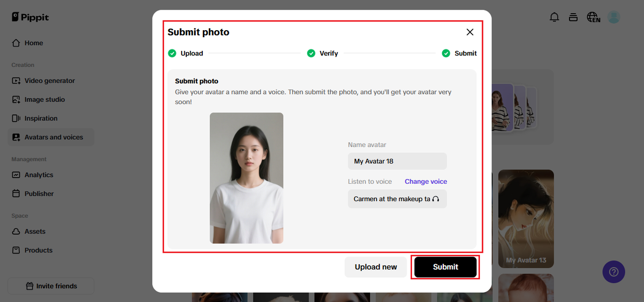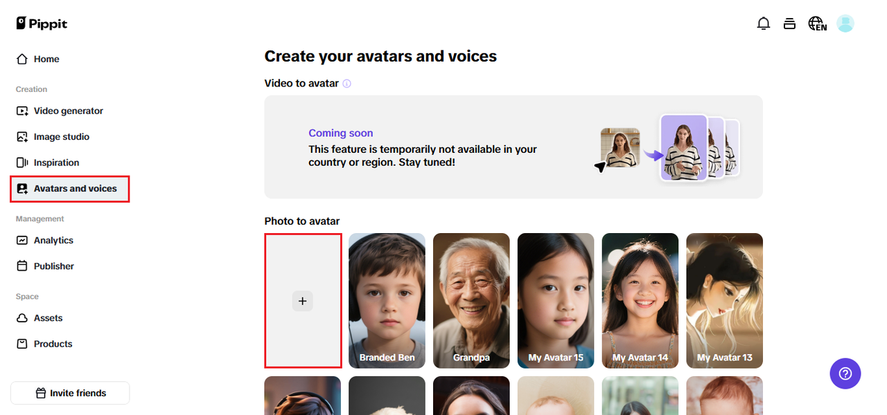 Once you're logged into your Pippit dashboard, go to the 'avatars and voices' section. This is where you start building your digital twin. Click on the '+' button to start working on your avatar. You will require a good, front-facing photo of yourself that is well lit. Do not worry about making complex edits or even designing. Pippit makes it easy for you.