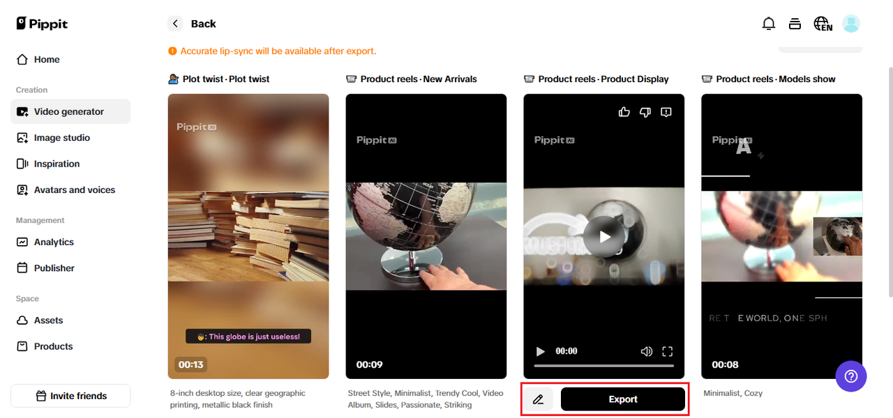 Now it's the creative phase. With your avatar set up, click 'apply' to bring up the editing tools. Here you can script your reaction text and have your avatar say it with lip sync. Want to change the background? Insert transitions? Add background music? You name it. Once it all feels just right, click 'export' to complete your split screen masterpiece. You can save in high res and post instantly to your platform of choice. Or send a link to video for people to watch or share.